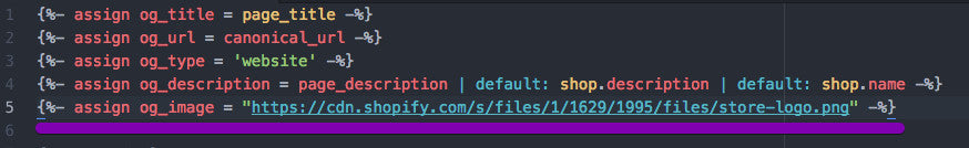 В самом верху файла social-meta-tags мы видим базовые теги Open Graph, которые применяются к веб-сайту. Эти правила будут применяться ко всем страницам Shopify, кроме тех страниц, для которых настроено переопределение.
